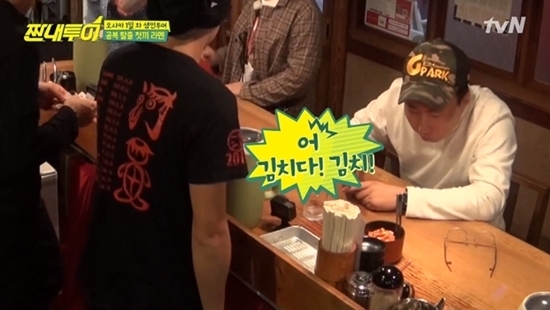 한켠에서 물을 따르고 있던 박명수는 종업원이 김치를 밑반찬으로 주자 "어! 김치!"라며 반가워했다.