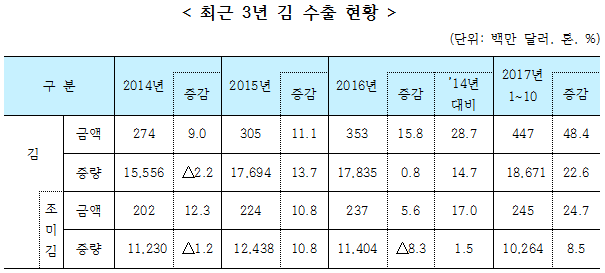 관세청 관계자는 “세계적으로 웰빙식품에 대한 관심이 늘어나 칼로리가 낮고 단백질, 비타민 함량이 높은 김의 수요는 꾸준히 증가할 것”이라며 “김을 원료로 한 ‘김스낵’이 건강 간식으로 관심이 높아지고 있어 올해 김 수출은 연중 5억 달러를 넘어설 것으로 기대된다”고 밝혔다.