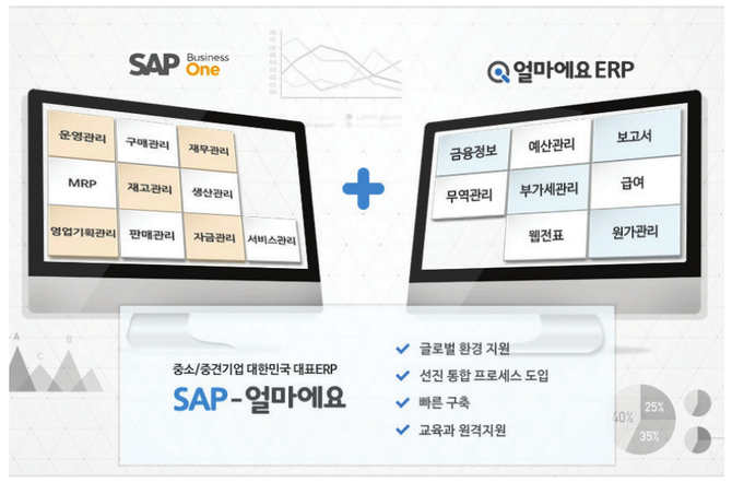 단순히 SAP의 프로그램을 재판매하려고 그대로 가져온 것이 아닙니다. 아이퀘스트의 ‘얼마에요ERP’와 세계적 ERP 표준으로 자리잡은 독일 SAP의 ‘SAP 비지니스 원(Business One) ERP’이 결합한 제품입니다.