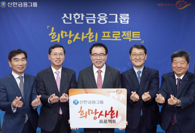![신한금융그룹 조용병 회장(사진 가운데)과 그룹 CEO들이 '희망사회 프로젝트'의 성공적 추진을 위해 기념촬영을 하고 있다.(왼쪽부터 신한금융투자 김형진 사장, 신한카드 임영진 사장, 신한금융그룹 조용병 회장, 신한은행 위성호 은행장, 신한생명 이병찬 사장)[사진=신한금융그룹]](http://www.tfmedia.co.kr/data/photos/20171250/art_15130542648189_efd95e.jpg)