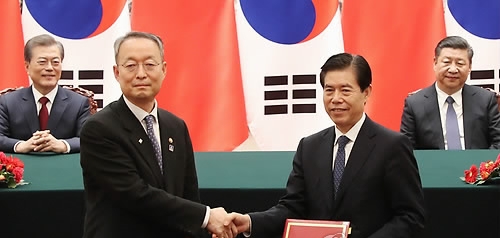 ![백운규 산업부 장관, 한-중 MOU 체결. 문재인 대통령과 시진핑 중국 국가주석이 14일 오후 베이징 인민대회당 서대청에서 백운규 산업부 장관(왼쪽)과 중산 중국 상무부장이 한-중 FTA 서비스ㆍ투자 협시 개시 MOU를 체결하는 모습을 지켜보고 있다. [사진=연합뉴스]](http://www.tfmedia.co.kr/data/photos/20171250/art_151329636767_0d3950.jpg)