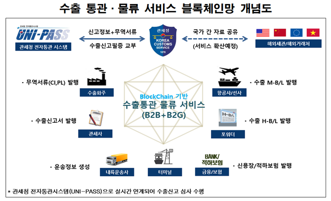관세청 관계자는 “수출기업이 수출통관 첨부서류를 블록체인망에 공유하면 위·변조가 불가능해짐에 따라 정보의 신뢰성과 정확성이 확보돼 서류제출 절차가 원천적으로 생략되고, 데이터의 재입력이 불필요해 신고서 오류 정정이 사라지는 등 수출 통관·물류 절차의 일대 혁신을 몰고 올 것”이라고 밝혔다.