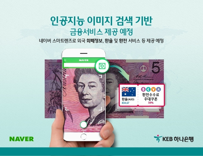 KEB하나은행과 네이버는 외국 실물화폐를 ‘스마트렌즈’로 촬영하면 ▲발행 국가 및 권종 조회 ▲환율 및 환전 정보 조회 가능한 서비스를 내년 1분기 내 제공할 계획이다. 또 ▲위조 및 변조 주의정보 조회 ▲환전우대쿠폰 제공 ▲사이버환전 등의 서비스도 추가할 예정이다.