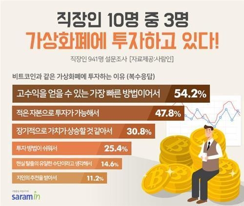 직장인 10명 가운데 3명 이상이 비트코인 등 가상화폐에 투자하고 있다는 설문조사 결과가 나왔다.