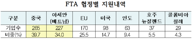 관세청이 667개 기업을 대상으로 수요조사를 실시한 결과 컨설팅 수요가 많은 협정은 중국(39.7%)과 베트남을 포함한 아세안(34%)으로 나타났다. 그동안 FTA 수출활용률이 낮은 아시아 국가로의 컨설팅 수요가 높았다는 분석이다.