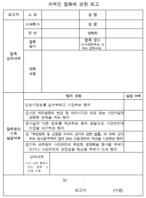 김 위원장은 여기서 한발 더 나아가 "일반 직원은 정해진 범위 내의 민간인을 접촉할 때만 보고해야 하지만 본인은 업무 관련성이 있는 모든 민간인 접촉을 보고하겠다"고 천명했다.