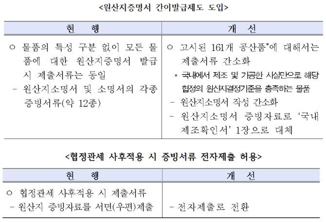 이에 관세청은 국내에서 제조, 가공한 사실만으로 해당 FTA의 원산지결정기준을 충족하는 라면과 조미용 김 등 161개 품목을 선별해 고시했다. 해당 품목은 원산지소명서를 간소하게 작성하고, 증빙자료도 최종 생산자가 작성한 ‘국내 제조 확인서’ 1장으로 대체할 수 있도록 했다.