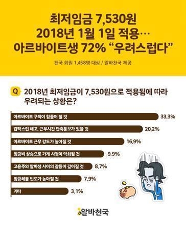 2일 구인·구직 아르바이트 포털 '알바천국'(대표 최인녕)에 따르면 지난달 21~29일 전국의 회원 1천458명을 대상으로 설문조사를 한 결과, '최저임금 인상에 따라 우려되는 상황이 있느냐'는 질문에 응답자 72%가 '그렇다'고 밝혔다.