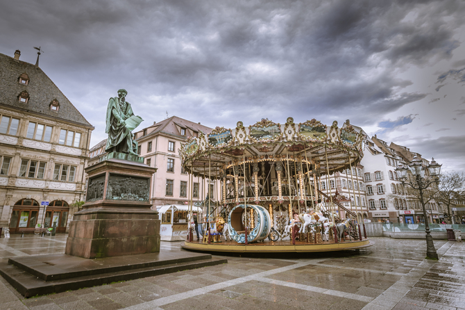 ▲ 구텐베르크 광장에 있는 구텐베르크 동상과 회전목마 , 대성당 앞으로 가는 골목 앞에 있다.