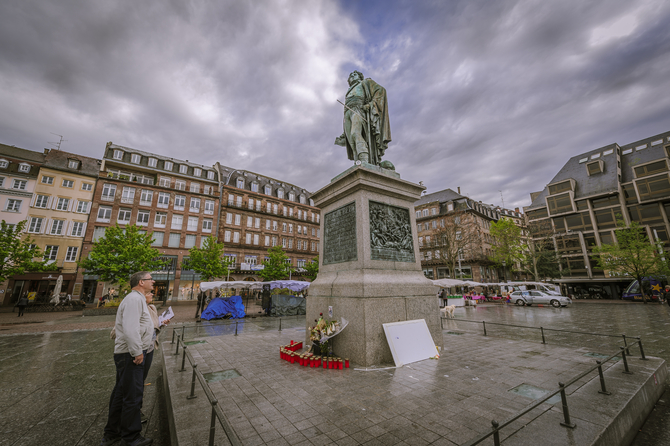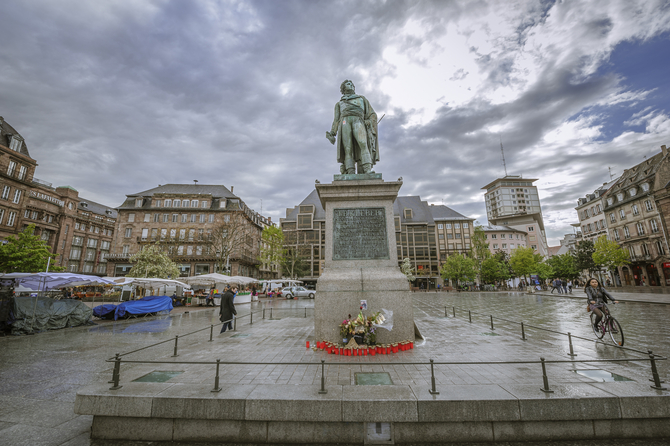 ▲ 클레베 광장에 서 있는 클레베르 장군 동상이다. 클레베 광장 주변은 상업지구이다. 그래서 그런지 다소 현대적이란 느낌을 받는다. 동상 앞에는 2015년 있었던 파리 참사의 추모가 이어지고 있는 모습이다.