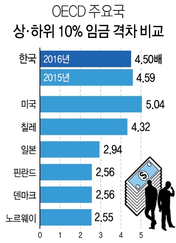 24일 OECD에 따르면 2016년 상위 10%의 한국 근로자 임금소득은 하위 10%의 4.5배로 관련 통계 자료가 있는 OECD 회원 10개국 중 미국(5.05배)에 이어 2위에 올랐다.