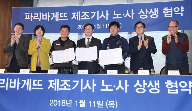 ![11일 오후 서울 여의도의 한 식당에서 열린 파리바게뜨 제조기사 노ㆍ사 상생 협약식에서 참석자들이 기념촬영하고 있다 [사진=연합뉴스]](http://www.tfmedia.co.kr/data/photos/20180104/art_15167700730535_3e066d.jpg)