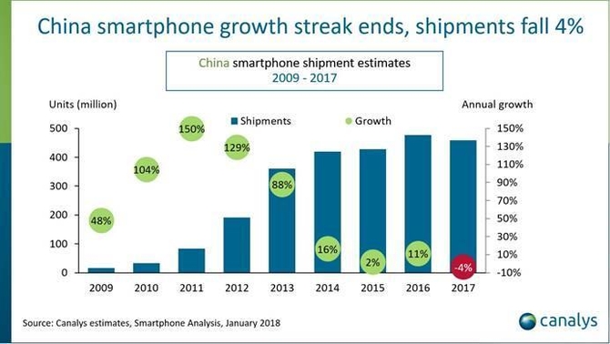 26일 시장조사업체 카날리스에 따르면 지난해 중국 시장의 스마트폰 출하량은 전년 대비 4% 감소한 4억5900만대를 기록했다.