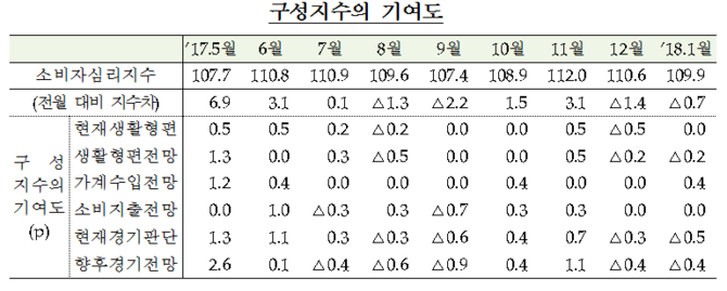 한국은행이 26일 발표한 ‘2018년 1월 소비자 동향 조사 결과’에 따르면 이달 소비자심리지수(CCSI)가 전월대비 0.7포인트 하락한 109.9를 기록했다.