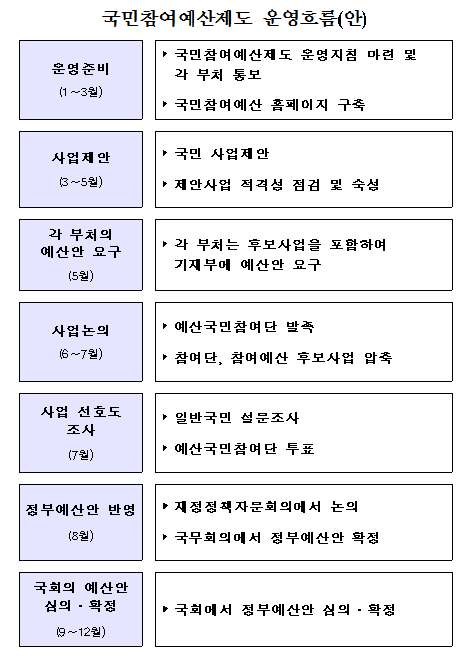 국민예산참여제도는 ▲사업제안 ▲사업논의 ▲사업 우선순위 결정 단계로 구성된다.