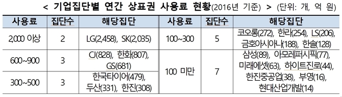 계열사들이 지급하는 상표권 사용료는 개별 집단별로 큰 차이를 보였으며 LG와 SK 등은 각각 2458억원, 2035억원을 연간 지급한 것으로 집계됐다.