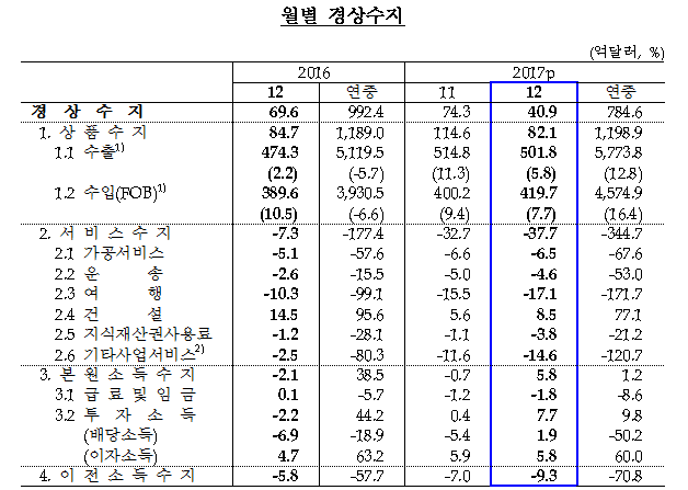 (조세금융신문=심재완 기자) 지난해 12월 경상수지가 40억 9000만달러 흑자를 기록했다. 지난해 경상수지는 총 784억 6000만달러로 20년 연속 흑자 행진을 이어갔다. 반면 서비스수지는 여행수지 악화 등으로 역대 최대 적자규모를 보였다.