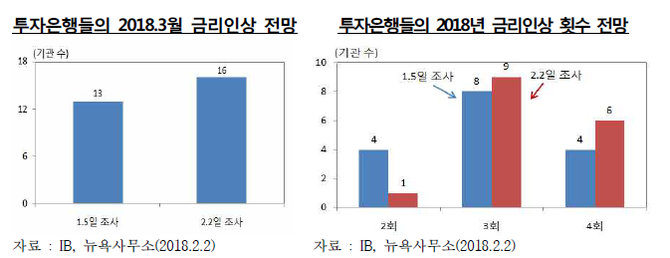 한은 뉴욕사무소가 발표한 ‘최근의 미국경제 상황과 평가' 보고서에 따르면 지난 2일 16개의 해외투자은행(IB)을 대상으로 조사한 결과 16곳 모두 3월 금리 인상을 예상하고 있다. 또 올해 4차례 금리 인상을 전망하는 곳도 6곳으로 나타나 지난달 조사 때보다 2곳 더 늘어났다.
