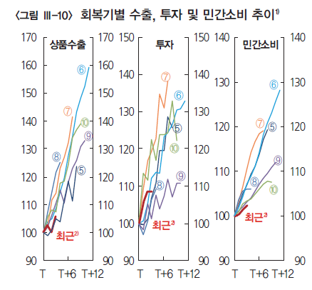 과거 우리나라 경기 회복기는 대체로 세계 경제의 회복 국면과 일치했다. 글로벌 경기 상승이 동반된 회복기에는 강도가 더 강하고 기간도 길었다. 여섯 번의 회복기 중 네 차례가 글로벌 경기 회복기에 발생했다.