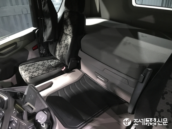 차량 내부는 운전자의 안전과 편의사양을 고려한 티가 역력했다. 실내 전고는 성인 남자 한 명이 서 있어도 머리 위 공간이 30cm 이상 남을 정도로 높았다. 또 운전석 뒤쪽에는 장시간 운전하는 고객이 쉴 수 있도록 최대 1m 확장이 가능한 침대가 구비돼 있었다.