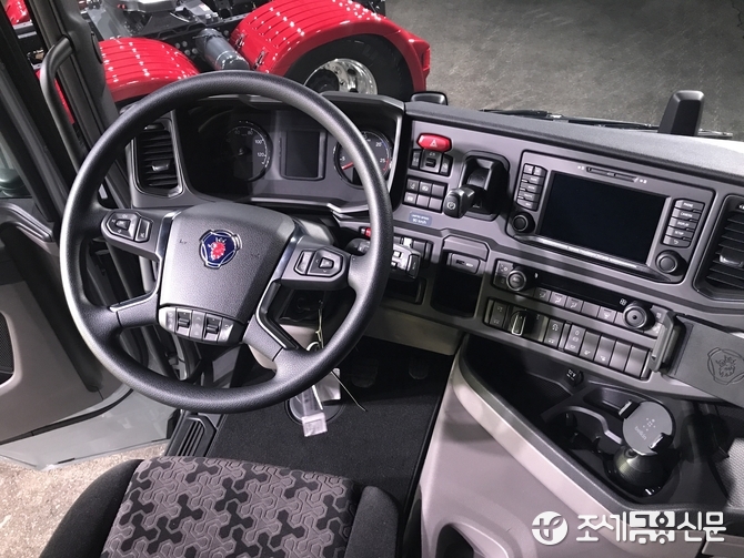 먼저 시승을 하기 위해 운전석에 오르니 승용차에서는 느낄 수 없는 탁 트인 시야가 펼쳐졌다. 올 뉴 스카니아는 운전자에게 명확한 시야를 제공하기 위해 이전 모델보다 운전석 위치가 전면 유리보다 65mm 가깝게 조정됐으며 측면으로도 20mm 이동해 재배치됐다.