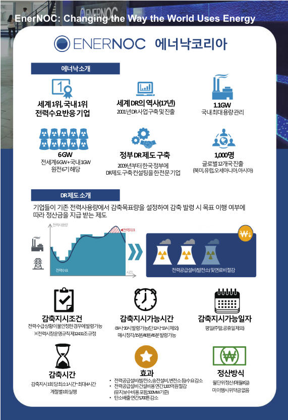 에너낙 코리아(EnerNOC Korea)의 본사인 에너낙(EnerNOC)은 2001년 설립된 글로벌 1위 전력수요관리 업체로 미국 보스턴에 본사를 두고 북미, 유럽, 호주, 한국, 뉴질랜드, 일본, 대만 등 12개 국가에서 에너지관리 컨설팅과 전력수요관리를 제공하고 있다.