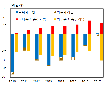 국내 중소‧중견기업은 12억 6000만달러를 기록해 흑자를 보였으며, 특히 대기업(2000만달러)은 소액이지만 최초로 흑자 전환했다.