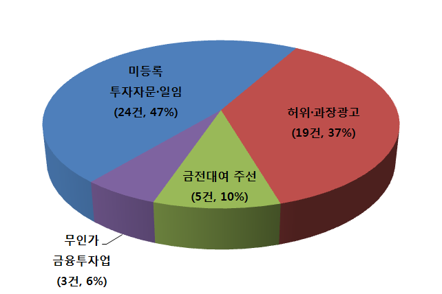 홈페이지 게시판‧카카오톡 채팅방 등을 통한 미등록 투자 자문·일임이 24건으로 가장 많았다.
