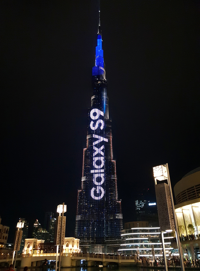 이번 '갤럭시 S9'·'갤럭시S9+' 광고는 부르즈 칼리파 외벽에 설치된 LED 파사드(Facade)를 통해 이틀간 다섯 차례에 걸쳐 진행됐다.