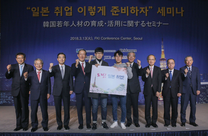 사진 왼쪽부터 서석숭 한일경제협회 부회장, 권태신 전경련 부회장, 김윤 한일경제협회 회장, 허창수 전경련 회장, 취업준비생(2명), 에가시라 토시아키 경단련 위원장, 나가미네 야스마사 주한일본대사, 무쿠타 사토시 경단련 전무, 코레나가 카즈오 일한경제협회 전무.