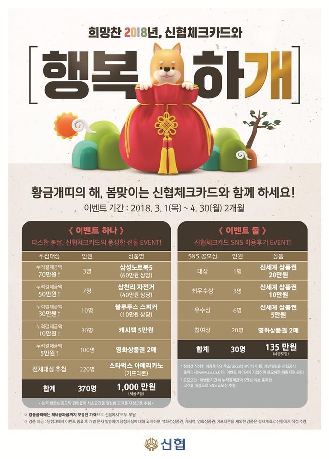 한편, 신협에서는 2018년 황금개띠의 해를 맞아 3.1 ~ 4.30일까지 2개월 간 봄맞이 ‘행복하개’프로모션을 진행 중이다. 신협체크카드를 보유하고 해당 기간 중 1회 이상 사용한 모든 고객이 이벤트 대상이며 삼성노트북5, 삼천리자전거, 블루투스 스피커, 5만원 캐시백, 영화상품권 2매, 스타벅스 아메리카노 등 다양한 상품을 추첨하여 제공한다.