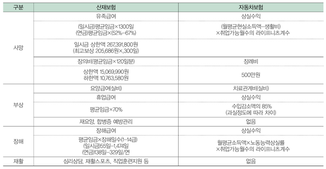 2) 산재보험에는 사망이나 장해가 남은 경우 평생 지급되는 연금제도(장해·유족연금)가 있지만, 자동차보험은 일시금으로 지급하므로, 남은 가족에게 산재보험이 더 유리하다.