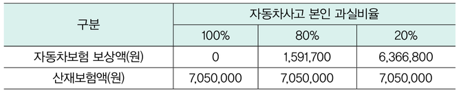 ㅇ 산재보험은 과실여부와 무관하게 보상하기 때문에 재해자 과실에 따라 보험금 지급이 제한되는 자동차보험보다 보상수준이 높음