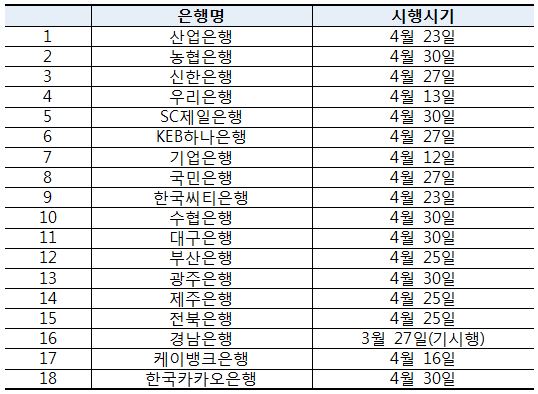 은행연합회는 전산 개발 등 일정에 따라 구체적 시행일정은 은행별로 다르다고 전했다.