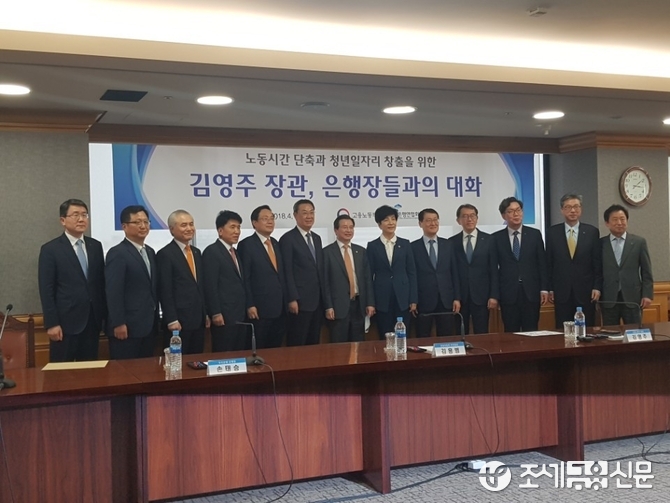 김 장관은 19일 서울 중구 전국은행연합회에서 개최된 ‘노동시간 단축 관련 은행업종 간담회’에 참석해 “근로시간 단축이 청년일자리 확대로 이어지기를 노력해달라”고 당부했다. 이날 행사에는 김 장관을 비롯해 김용범 금융위원회 부위원장과 김태영 전국은행연합회장, 주요 시중은행 은행장들이 참석했다.