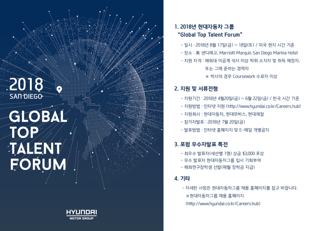 현대자동차그룹은 오는 8월 17~18일 이틀간 미국 샌디에이고(San Diego)에서 ‘현대자동차그룹 글로벌 탑 탤런트 포럼(Hyundai Motor Group Global Top Talent Forum)’을 개최, 해외 이공계 석·박사급 우수인재 발굴에 나선다고 20일 밝혔다.