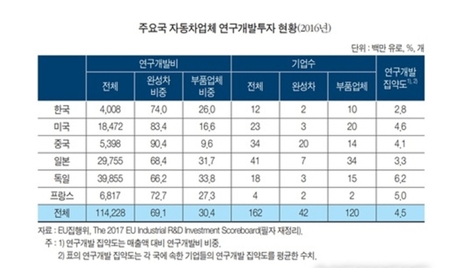 국내 완성차 기업들의 연구개발(R&D)비 비중이 글로벌 기업에 비해 크게 떨어지고 글로벌 인수합병(M&A) 또한 한국만 뒤처지고 있기 때문이다.
