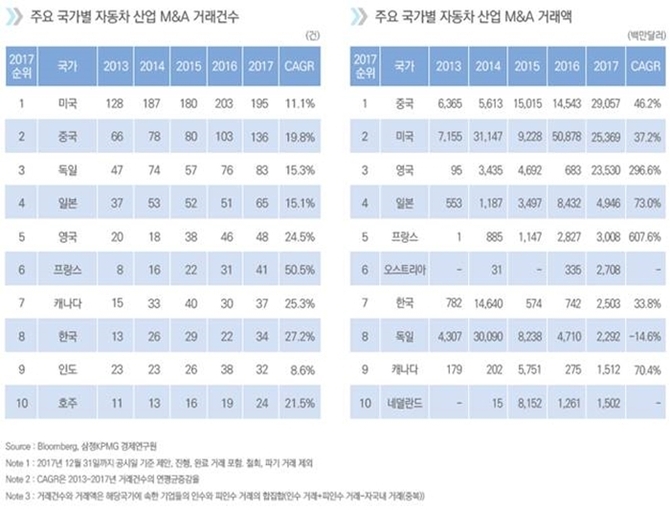 다국적 회계컨설팅 기업인 삼정KPMG에 따르면 지난해 국가별 자동차산업 연간 M&A 거래액은 ▲중국(290억 달러·약 30조9800억원) ▲미국(254억 달러·약 27조1300억원) ▲영국(253억 달러·약 27조300억원) ▲일본(49억 달러·약 5조2400억원) 순이었다. 반면 한국은 25억 달러(약 2조6700억원)에 불과했다.