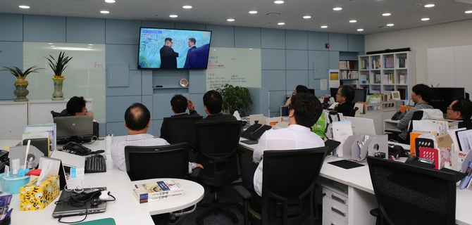 (조세금융신문=박가람 기자) 서울의 한 기업 직원들이 업무를 중단하고 역사적 남북정상회담의 현장을 함께 하고 있다.