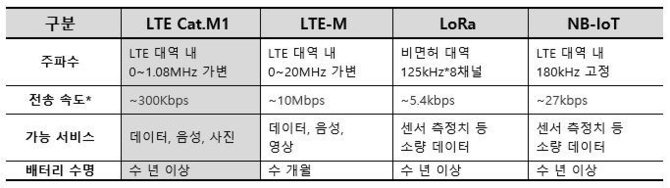 LTE Cat.M1은 국제 표준화단체 3GPP가 표준화한 저전력 광대역(LPWA) 기술로 HD급 사진과 저용량 동영상 전송이 가능한 것이 특징이다. 전력 효율이 높고 통신 모듈 가격도 기존 LTE-M 대비 약 30% 저렴하다.