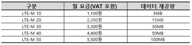 또 상용화에 맞춰 LTE Cat.M1 전용 요금제도 출시했다. 요금제는 월 1100원부터 5500원까지 5종이며 데이터 제공량은 회선당 5~100MB다.