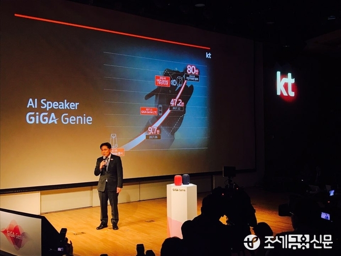 KT는 3일 오전 서울 광화문 KT 스퀘어에서 ‘AI 신규 서비스 및 기술 발전 방향’ 기자간담회를 열고 AI 스피커 ‘기가지니’ 가입자를 상반기 100만명, 연말까지 150만명 확보하겠다는 전략을 발표했다.