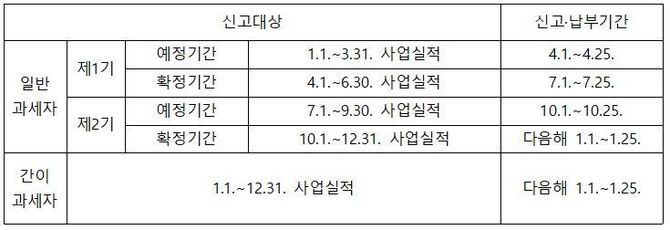 법인인 일반과세자의 경우 1기 예정·확정기간, 2기 예정·확정기간마다 각각 분기별로 총 4번의 신고를 해야 한다.