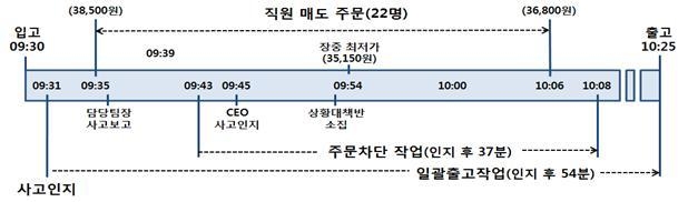 또한 직무분류상 ‘우리사주 관리’ 업무는 총무팀 관할임에도 불구하고 증권관리팀이 실무 처리를 진행하는 등 업무분장도 제대로 돼있지 않았고 관련 매뉴얼도 존재하지 않았다. 사내 방송시설, 비상연락망 등도 갖춰져 있지 않아 전체 임직원에 대한 신속하게 사고내용 전파, 매도금지 요청 등이 이뤄지지 못했다.