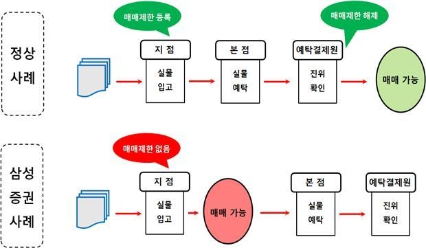 실물주식 입고 시스템에도 문제점이 발견됐다. 기본적으로 고객의 주식매도는 예택결제원에 실물 입고된 주식의 진위성을 확인 받은 후 허용하도록 돼있으나 삼성증권 시스템은 예탁원의 확인 없이도 매도할 수 있게 설계돼있다. 실제로 지난 2013년 1월부터 올해 4월까지 실물입고된 9478건 중 118건이 예탁결제원 확인 전에 매도된 것으로 드러났다. 위조주식은 아니었으나 사고의 위험성에 노출돼 있었던 셈이다.