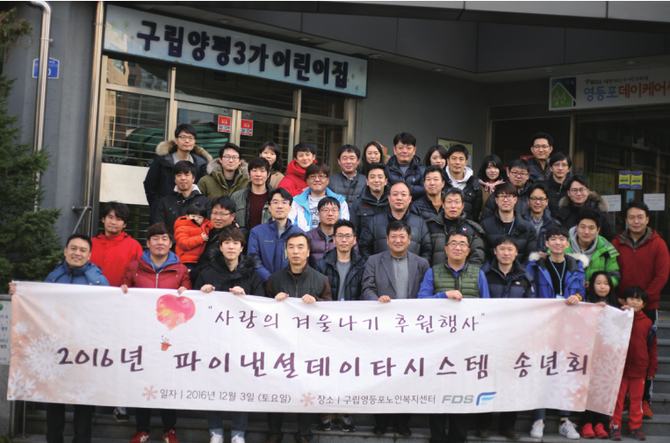 한편, FDS는 다양한 사회활동 및 직원들의 복지증진을 위해 노력하고 있다. “2016년 송년회는 구립영등포노인복지 센터와 공동으로 영등포 내 저소득 어르신 30가구를 직접 방문하여 겨울철 난방 지원, 이불 및 쌀을 전달했다.”