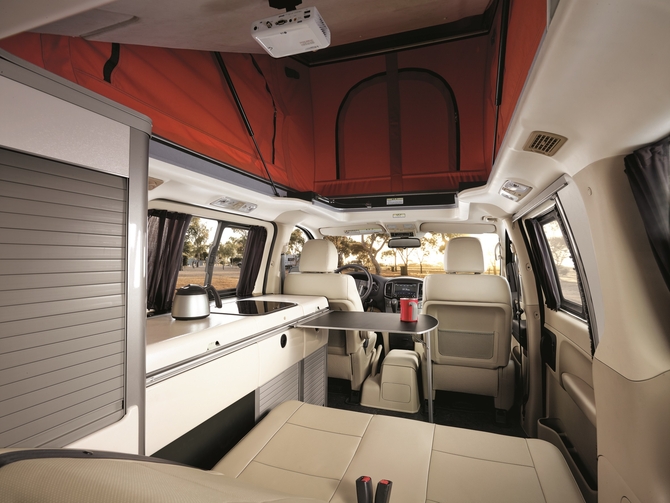 베이지 컬러의 고급 가죽 시트, 브라운 컬러의 주름식 커튼, 주황색 계열의 버밀리언 컬러를 적용한 팝업텐트로 구성됐고 2열과 3열에는 0도부터 90도까지 기울기 조절이 가능한 쿠션 시트를 적용해 공간 활용성을 높였다.