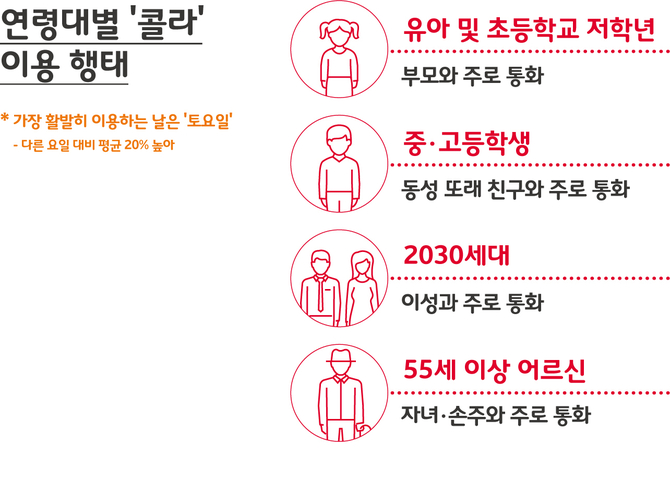 연령별로 9세 이하 아이들은 오후 5~8시에 영상통화를 가장 활발히 하는 것으로 집계됐으며 중·고등학생은 동성 또래 간 통화 비율이 57%, 20~30대는 이성간 통화 비율이 68%였다. 또 55세 이상 콜라 이용자의 전체 통화 중 65%는 자녀, 손주와의 통화였다.