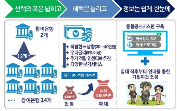 병사들의 선택권을 위해 신규 국군병사적금 취급은행도 기존 2개 은행에서 14개 시중은행으로 확대된다. 오는 7월부터 가입할 수 있다. 다만 재정·세제 인센티브의 경우 내년 예산안과 세법개정안에 반영되기 때문에 내년 1월1일 이후 만기가 도래하는 적금부터 적용된다.