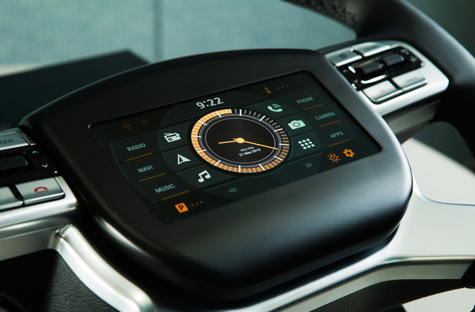 사고 발생 시에 운전자가 2차 피해를 입지 않도록 설계된 6.22인치 언브레이커블 스티어링휠(Steering wheel) 디스플레이는 깨지지 않는 플렉시블 OLED 기판에 플라스틱 소재의 차세대 커버 윈도우를 장착했다.